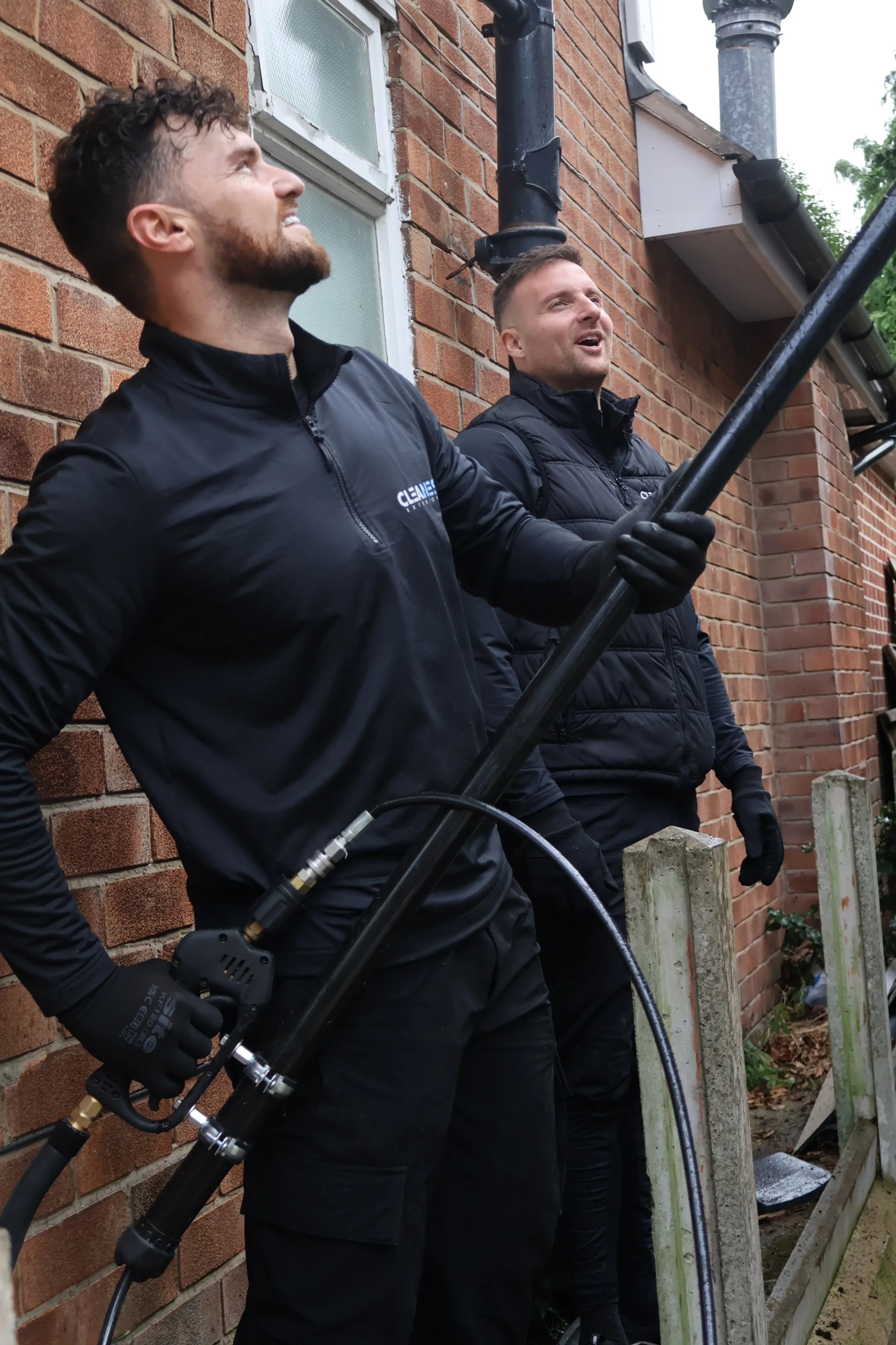 We use SkyVac™ vacuum-powered technology to clear gutters safely from ground level — no ladders required